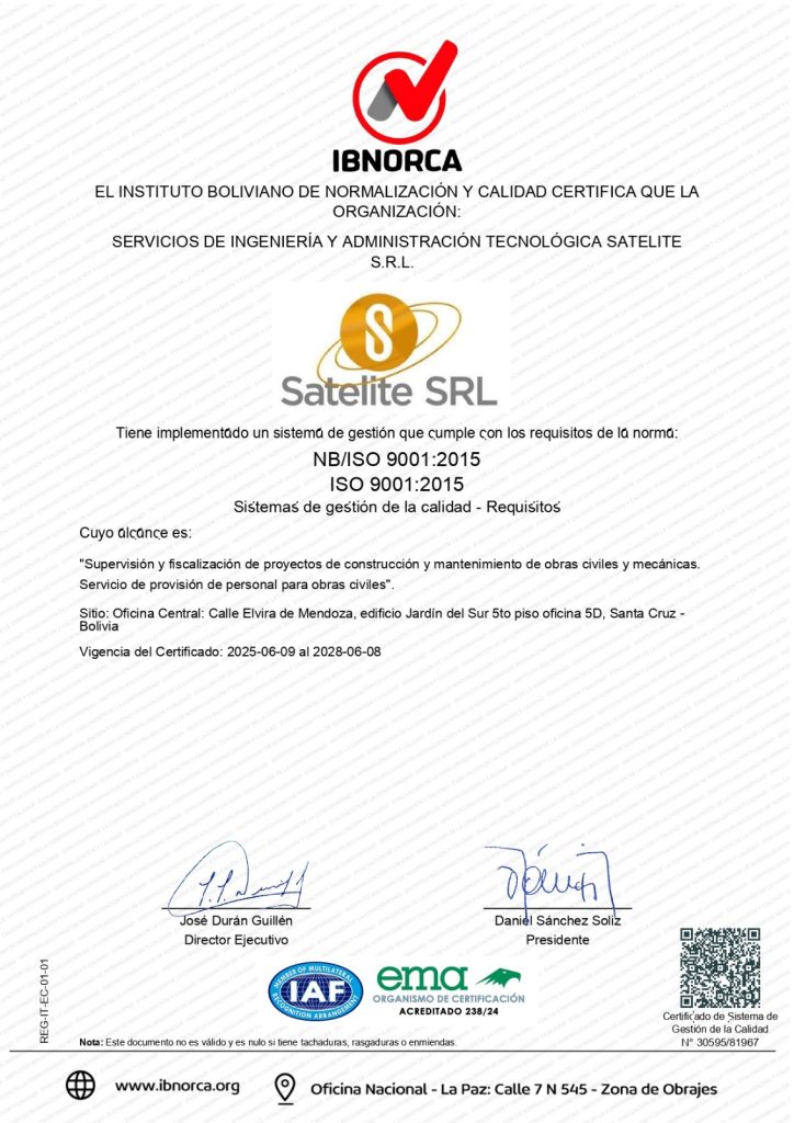 POLITICA DE CALIDAD: SATELITE SRL. Empresa de Servicios de Ingenieria y Administracion Tecnologica, se compromete a proporcionar recursos humanos y tecnicos que permitan satisfacer las necesidades de los clientes y otros requisitos legales o reglamentarios aplicables, asi como de cumplir los procedimientos establecidos y mejorar continuamente la eficiencia del sistema de gestión de la calidad.